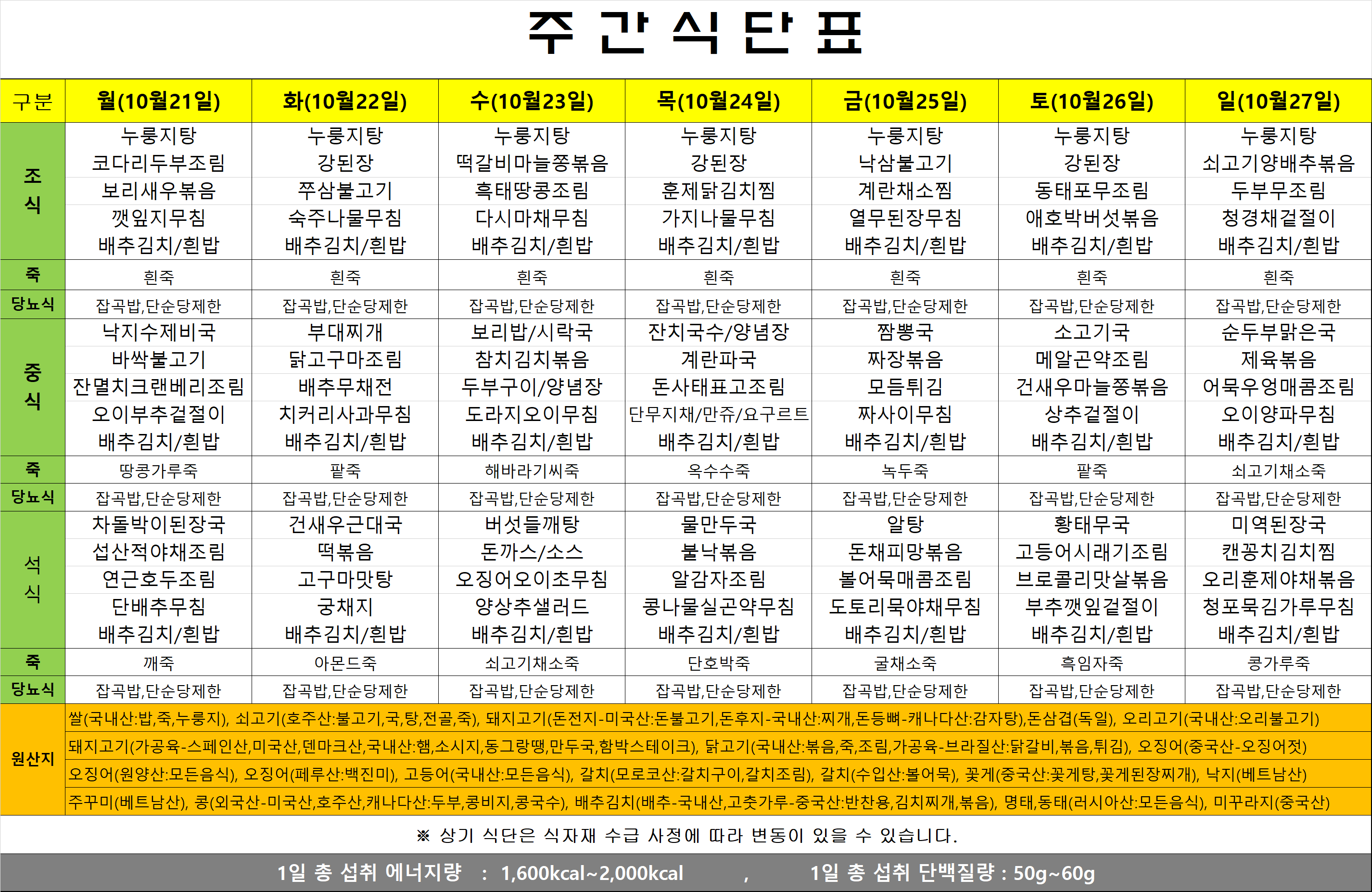식단표(24.10.21~10.27)